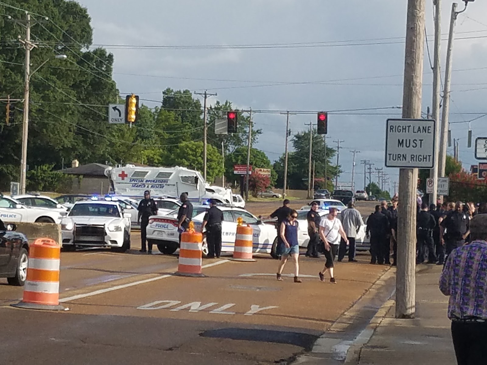 Police, photographers and fans gather near where protesters were congregating near Graceland. Photo: Don Wilson